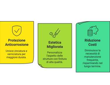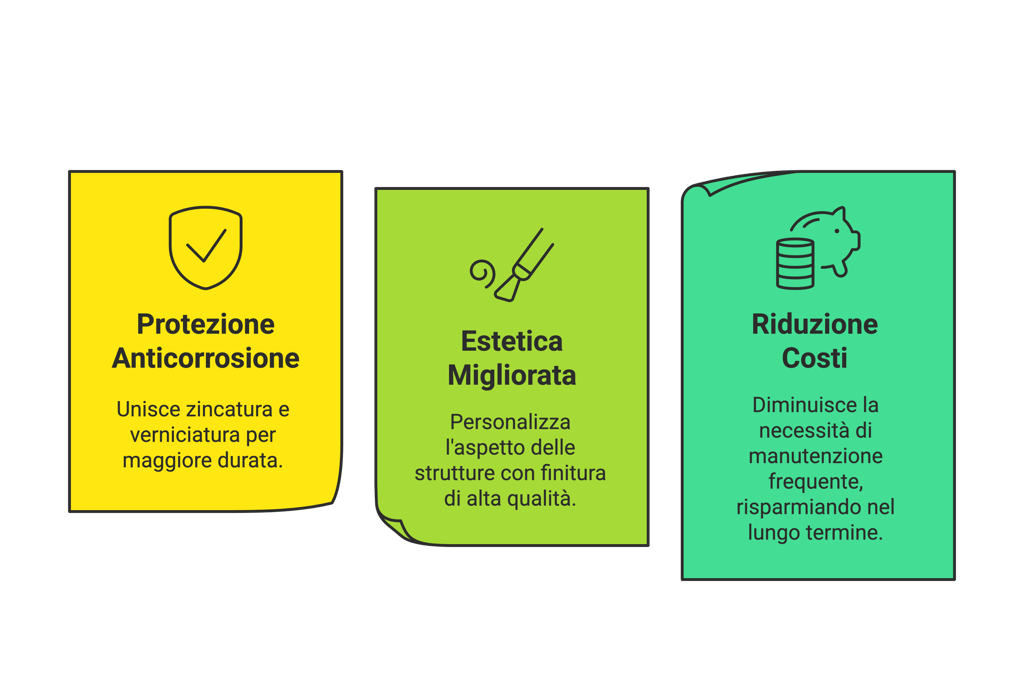 Protezione Anticorrosione Potenziata: l'unione di zincatura e verniciatura offre una durata maggiore rispetto all'applicazione singola di ciascun trattamento. La combinazione dei due sistemi può prolungare significativamente la vita utile delle strutture in acciaio.
