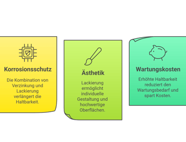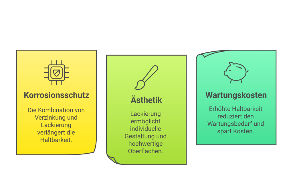 Erhöhter Korrosionsschutz: Die Kombination von Verzinkung und Lackierung bietet eine längere Haltbarkeit als die Einzeldurchführung jeder einzelnen Behandlung. Die Zusammenführung beider Systeme kann die Lebensdauer von Stahlkonstruktionen erheblich verlängern.